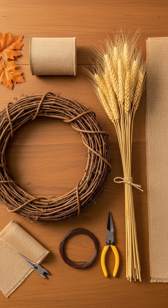 - Materials: grapevine wreath base, a small bundle of faux wheat, floral wire, and one wired bow.