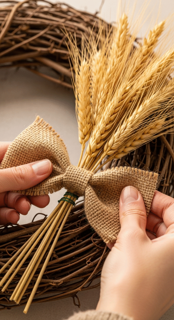 - Steps: Secure wheat bunch on one side with floral wire, add bow. Done.