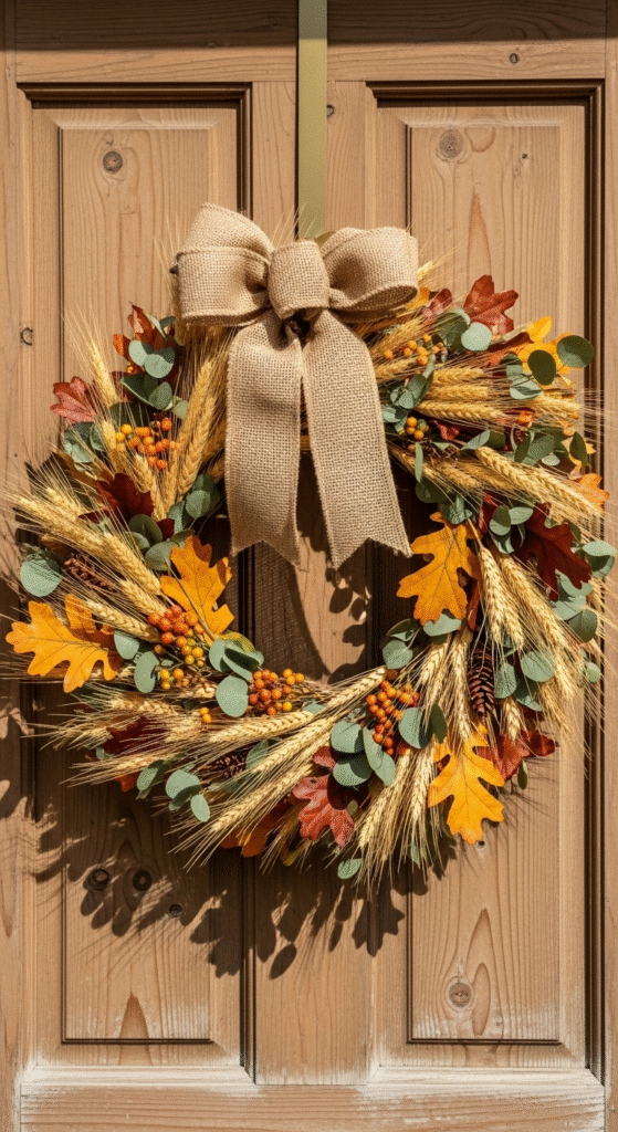 - Materials: foam wreath base, faux eucalyptus stems, faux berries, mini pumpkins or acorns, hot glue gun.