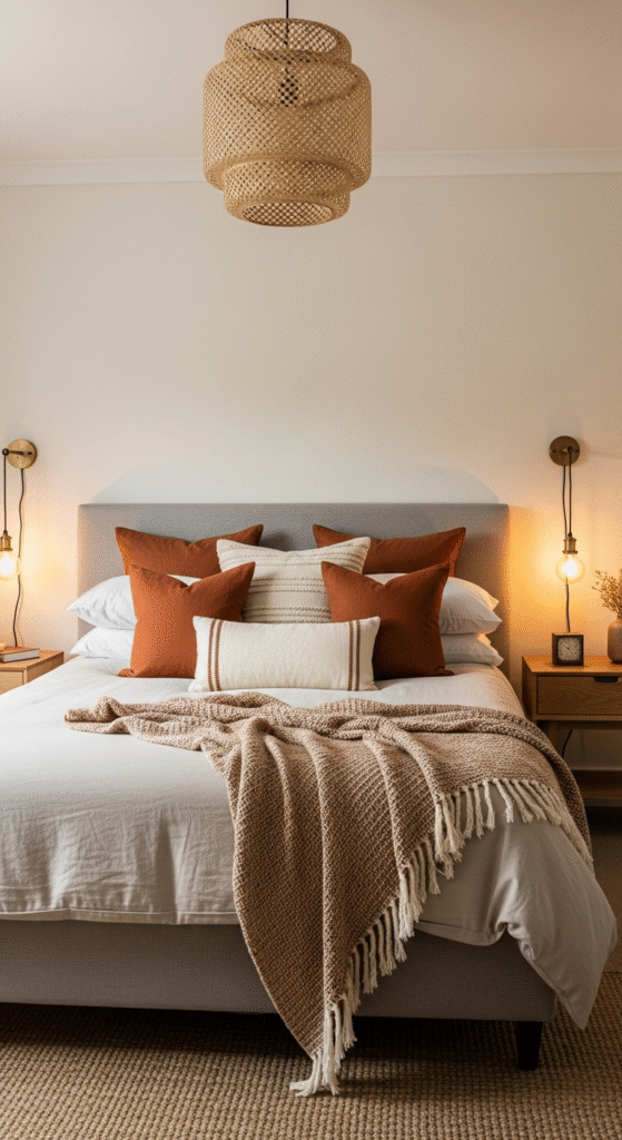Why it works: texture adds depth more than color alone. Chunky knits, woven baskets, wool throws and velvet pillows all read as “warm” to the eye — and to the hand.