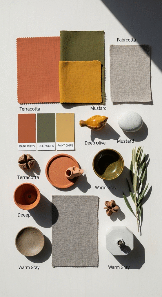 Fall doesn’t have to mean loud orange. For a modern Fall House, aim for muted, warm tones: terracotta, deep olive, mustard, warm gray, and cream. Think of these as the foundation you repeat across the home: pillows in the living room, towels in the kitchen, a runner in the entry.