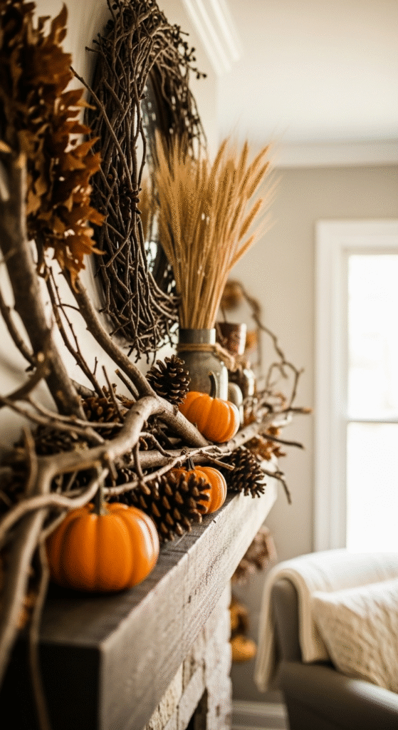 Nature is the fastest route to seasonal authenticity. Use branches, seed pods, dried wheat, pinecones, and pumpkins.